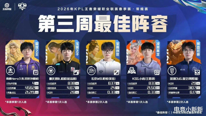 这乱世AG冠军五人组敢接吗?KPL第三周最佳阵容出炉:再次五队同框,坦然是A组之光!