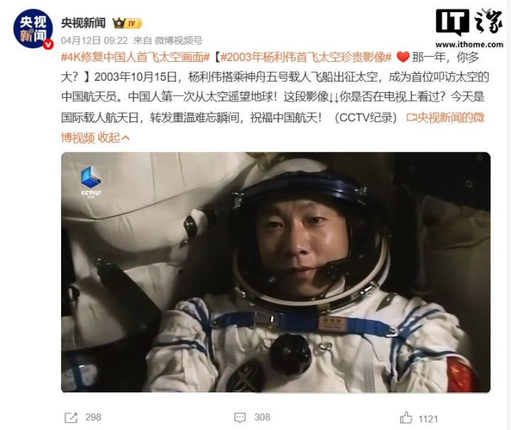 IT之家4月13日音问,2003年10月15日,杨利伟搭乘神舟五号载东谈主飞船出征天外,成为首位叩访天外的中国航天员。中国东谈主第一次从天外瞭望地球。 总台CCTV记载4月12日放出了4K建造杨利伟首飞天外格外画面。
