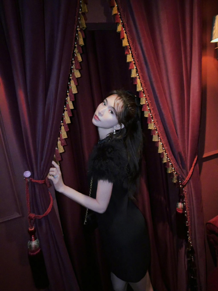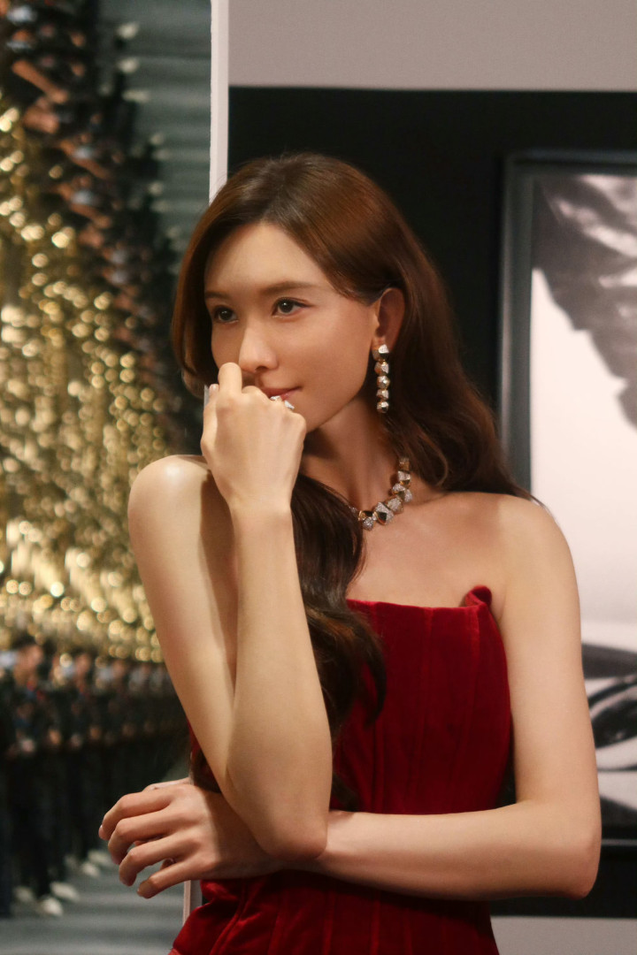 大海潮鬈发慵懒垂落,衬得她眉眼怜惜又明艳,红唇点缀更添一抹风情。红裙的强烈与她的温婉气质碰撞出极致张力,仿佛从因循画报中走出的名媛。