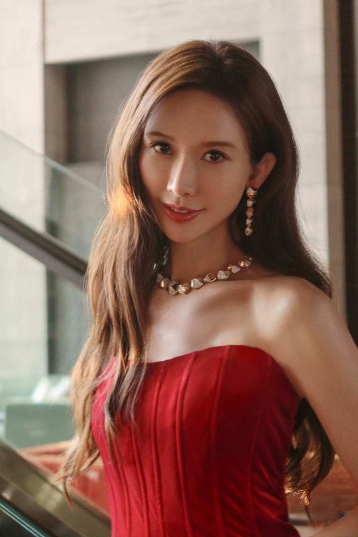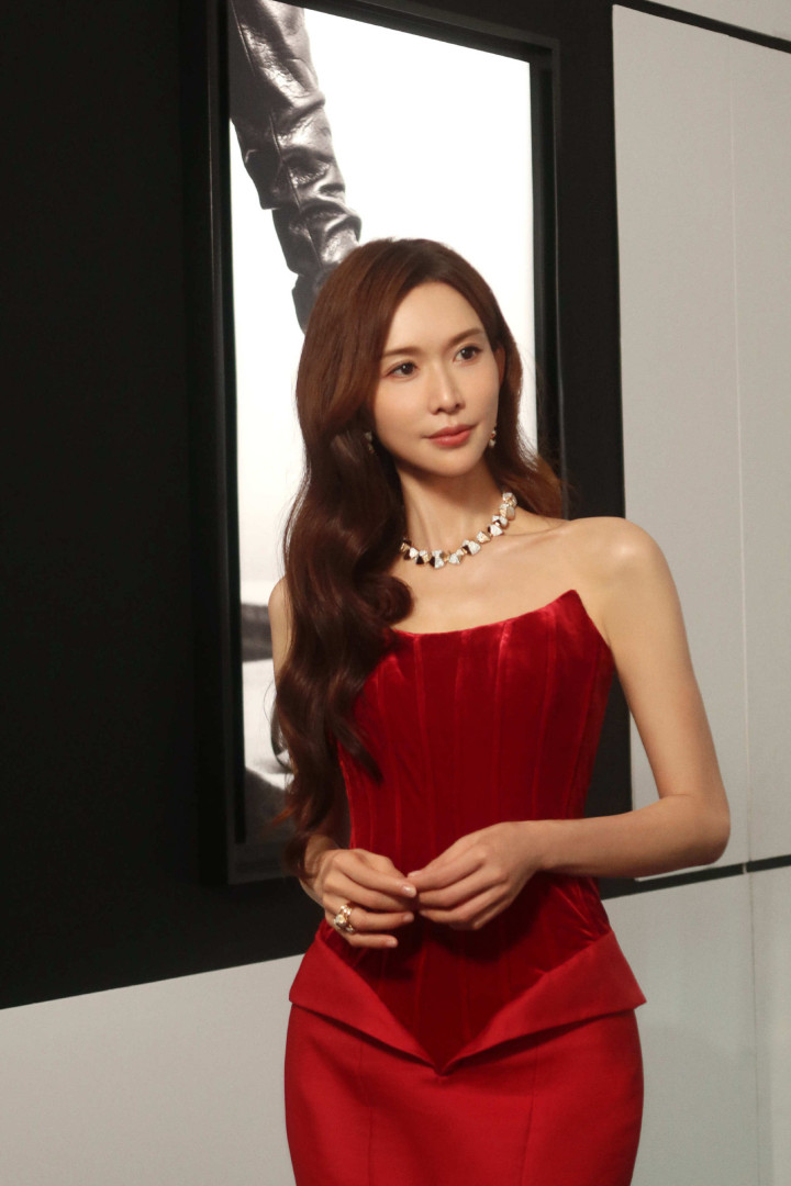 酒红色丝绒抹胸裙勾画出林志玲玲珑有致的身体,因循丝绒的质感自带高等氛围感,抹胸筹画大方展露肩颈线条,搭配钻石项链与耳环,将贵气与性感无缺交融。