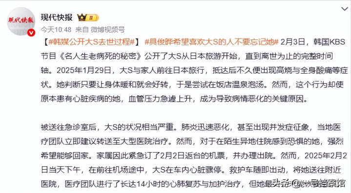 [免责声明]文章的时间、过程、图片均来自于网络,文章旨在传播正能量,均无低俗等不良引导,请观众勿对号入座,并上升到人身攻击等方面。观众理性看待本事件,切勿留下主观臆断的恶意评论,互联网不是法外之地。本文如若真实性存在争议、事件版权或图片侵权问题,请及时联系作者,我们将予以删除。 百科:徐熙媛、具俊晔、汪小菲个人资料 媒体:大S遗体已火化!小S和具俊晔将于6日返台,由具俊晔抱着大S骨灰.鲁中晨报.2025-02-04 大S东京医院猝逝,全家人守病榻,不信她真的离开了.海峡导报 #具俊晔说要保护徐熙媛最爱的全部#.新浪娱乐.2025-02-06 大S生前陷离婚拉锯战:最后微博回击传言,与前夫有经济纠纷.百家号 |