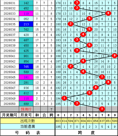 福彩3D第2026050期最大跨度开出3,近期最大跨度波动较大,本期瞻望最大跨度在5-9区段开出,最大跨度参考6789,一码跨度参考7。